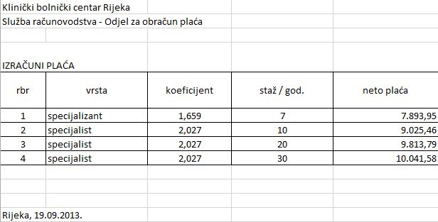 U KBC-u Zagreb odjelni liječnik s 20 godina staža i tri dežurstva mjesečno ima neto plaću od 10.583 kune. S pet dežurstava plaća mu je 11.450 kuna.