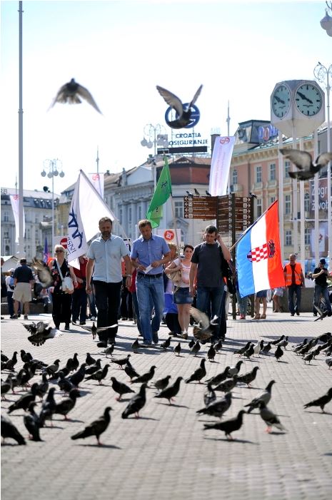 "Danas se na Markovu trgu prodaje Poštanska banka i Croatia osiguranje, sutra to namjeravaju učiniti s cestama, a prekosutra će na red doći vode, šume i što sve ne da bi se pokrio državni proračun", kaže šef sindikata Mijat Stanić.