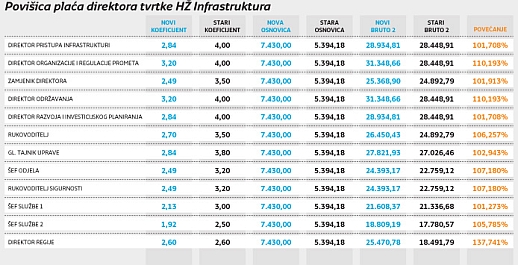Nekima, poput direktora regija, plaća je povećana čak 37 posto. Ključ te povišice krije se u novoj metodologiji obračuna. Iako su koeficijenti za gotovo sva vodeća mjesta smanjeni u odnosu na stari pravilnik, koji je u studenome 2011. donijela bivša uprava kompanije, Peričić je znatno uvećao osnovicu za obračun plaće. Po starom pravilniku ona je iznosila 5394,18 kuna, a po novom prošlogodišnja prosječna bruto plaća iz kompanije umanjena je za iznos prosječnog radnog staža. Iako se u odluci ne navodi točan iznos, neslužbeno se doznaje kako ona za 2011. u HŽ Infrastrukturi iznosi 7430 kuna. Temeljem toga ispada da će i uz manje koeficijente direktori zarađivati više, a oni rijetki kojima koeficijenti nisu smanjeni, poput direktora regija, u bruto iznosu primat će i po 7000 kuna veću plaću. Točnije, već su primili, s obzirom da je u odluci donesenoj 13. srpnja navedeno da se ona primjenjuje od 1. lipnja.