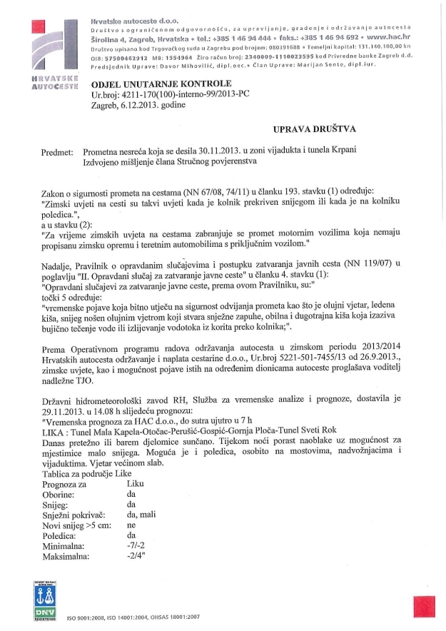 Svi pokazatelji prometne nesreće na vijaduktu Krpani upućuju na zaključak da je pojava ledene kiše od tunela Krpani prema čvoru Gospić izravni uzrok prometne nesreće, koja se dogodila prošle subote, no stanje na kolniku toga jutra nije upućivalo na zamrzavanje kolnika i pojavu ledene kiše, pa se zato nije provelo preventivno posipanje objekata, piše, uz ostalo, u Izvješću Stručnog povjerenstva HAC-a.