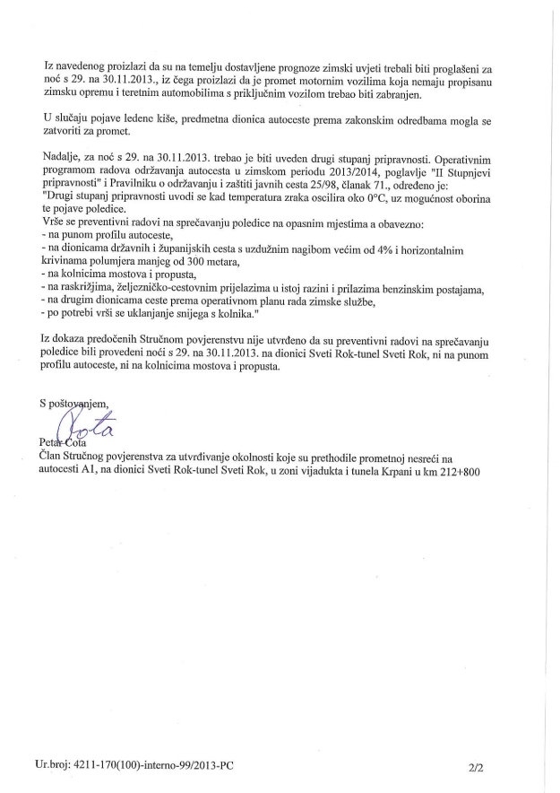 Ista služba je, uz Izvješće, dostavila i Izdvojeno mišljenje Petra Cote, također člana Stručnog povjerenstva, koji se nije složio u cijelosti s ostalim članovima te potpisuje mišljenje da su "na temelju dostavljene vremenske prognoze (Državnog hidrometeorološkog zavoda, do subote u 7 sati, za Liku), zimski uvjeti trebali biti proglašeni za noć s petka na subotu, iz čega proizlazi da je promet motornim vozilima koja nemaju propisanu zimsku opremu i teretnim automobilima s priključnim vozilom, trebao biti zabranjen".
