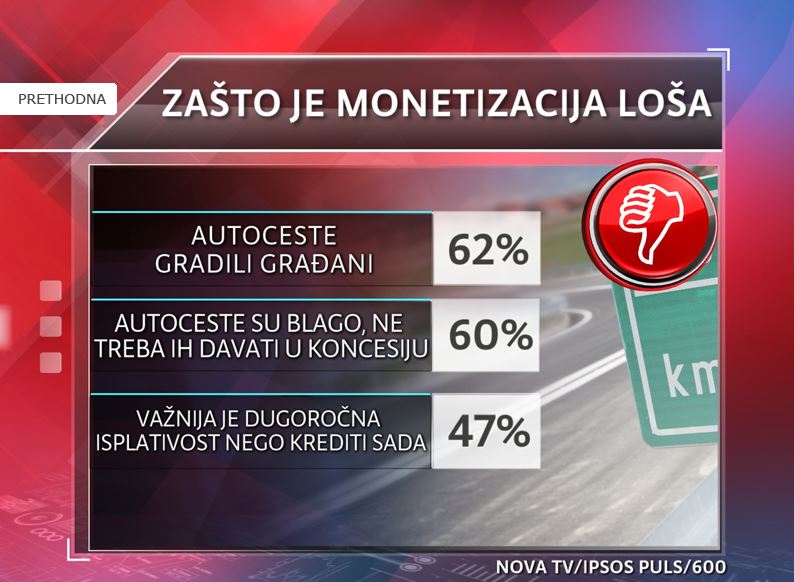 Protivnici koncesije ili monetizacije, njih 62 posto, misli da su autoceste građene novcima građana te da nije u redu da sada koncesionar profitira. Njih 60 posto misle da su autoceste nacionalno blago te ih ne treba davati strancima. 47,3 posto ispitanika misli kako je važnija dugoročna isplativost nego novac koji bi smanjio kredit.