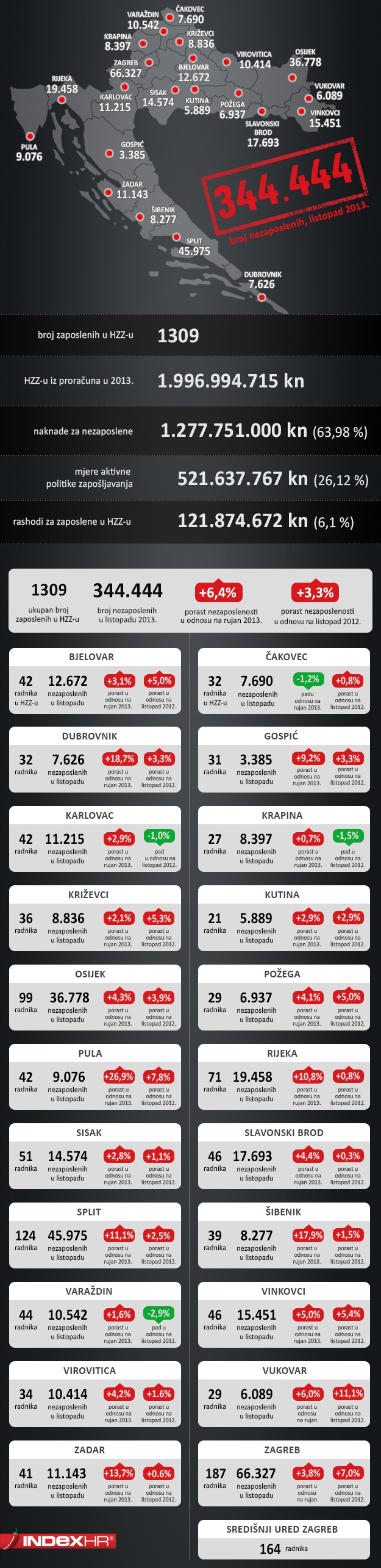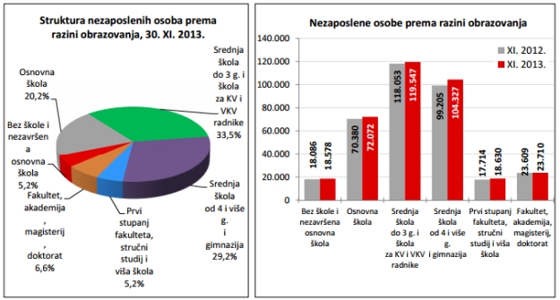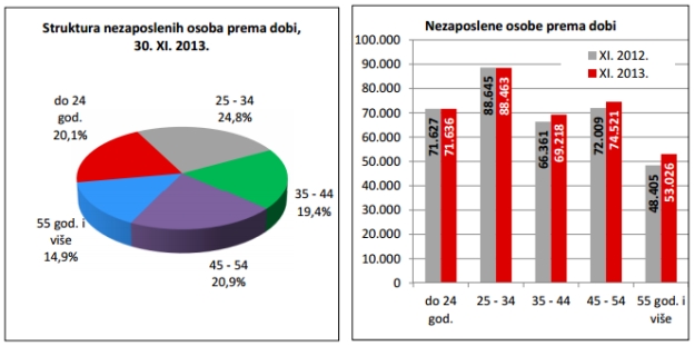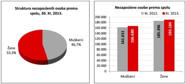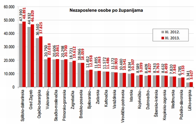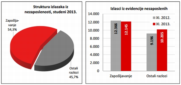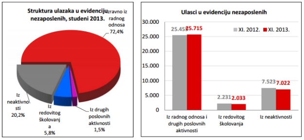 Prije nekoliko dana HZZ je objavio mjesečno izvješće za studeni. Zadnjeg dana studenog bile su registrirano 356.864 nezaposlene osobe. U usporedbi s listopadom 2013. broj nezaposlenih povećao se za 3,6 posto ili 12.420 osoba, a u odnosu na studeni 2012. godine broj nezaposlenih veći je za 2,8 posto ili 9.817 osoba.