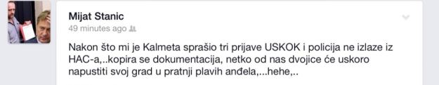 Nakon toga napisao je: "Nakon što mi je Kalmeta sprašio tri prijave, Uskok i policija ne izlaze iz HAC-a, kopira se dokumentacija, netko od nas dvojice će uskoro napustiti svoj grad u pratnji plavih anđela, hehe..", napisao je Stanić.