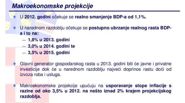 Okosnica ove Vlade u ekonomskom pogledu jesu financijska konsolidacija i štednja, naglasio je ministar financija Slavko Linić najavljujući kako bi sljedeće godine, s obzirom na rast energenata inflacija bi se mogla znatnije povećati sljedeće godine i to na 3,5 posto. U 2014. godini i 2015. godini inflacija bi se mogla vratiti na uobičajenih 2 posto. Linić je više puta naglasio kako Vlada mora intenzivirati svoje napore u disciplini naplate, a najavio je niz izmjena porezne politike koja je rezultat ulaska Hrvatske u Europsku uniju.
