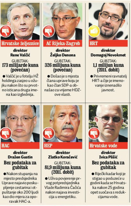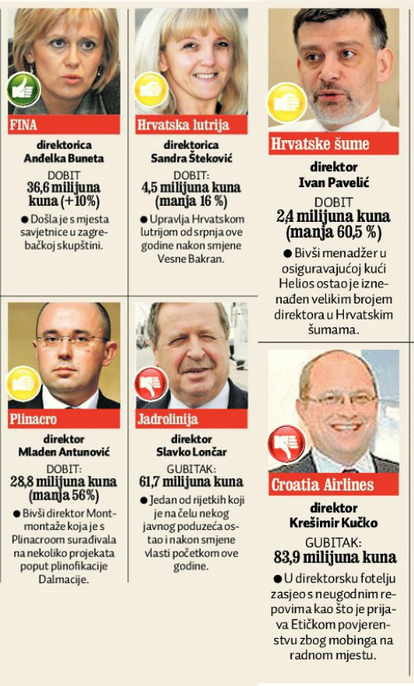 Hrvatska pošta, na čije je čelo u travnju ove godine došao Alen Premužak nakon smjene Roberta Jukića, u godinu je dana od dobiti koja je premašivala 27 milijuna kuna stigla na gubitak od 10,5 milijuna kuna. Slična je i situacija s Hrvatskim šumama koje upravljaju značajnim prirodnim bogatstvom Hrvatske. To je poduzeće značajno smanjilo dobit u godinu dana, a i kod njih je najavljivano smanjenje broja ljudi. Najbolje pokazatelje imaju Croatia osiguranje i Jadranski naftovod s rastom dobiti od 36,5, odnosno 12,5 posto. U Croatia osiguranju upravo je smijenjen Zdravko Zrinušić i na njegovo mjesto postavljen Krešimir Starčević, a Janaf vodi Dragan Kovačević, HNS-ov kadar.