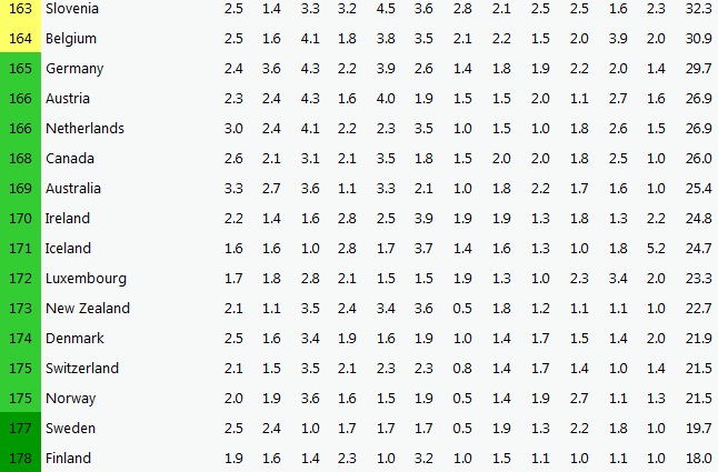 Među posljednjih su pet zemalja koje, dakle, spadaju među najuspješnije i najstabilnije Finska (178.), Švedska (177.), Norveška (175.), Švicarska (175.) i Danska (174.). Cijelu listu možete pogledati OVDJE.