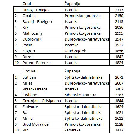 Na vrhu top liste najrastrošnijih gradova nalazi se Umag s potrošnjom 2713 kuna po stanovniku, druga je Opatija s 2150 kuna zatim slijede Rovinj (2113), Krk (2086) i Mali Lošinj (1995). Na šestom mjestu nalazi se Dubrovnik s 1947 kuna, zatim slijedi Pazin s 1927 pa tek onda Zagreb s 1856 kuna. Na dnu top 10 liste su Buzet i Poreč.
