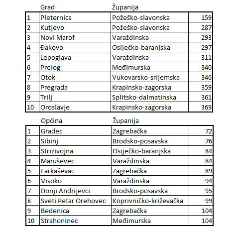 Naravno postoji i lista najštedljivijih gradova i Općina. Na vrhu liste gradova nalazi se Pleternica s 159 kuna po glavi stanovnika, dok Kutjevo troši 287 kuna. Tu su i Novi Marof (293),