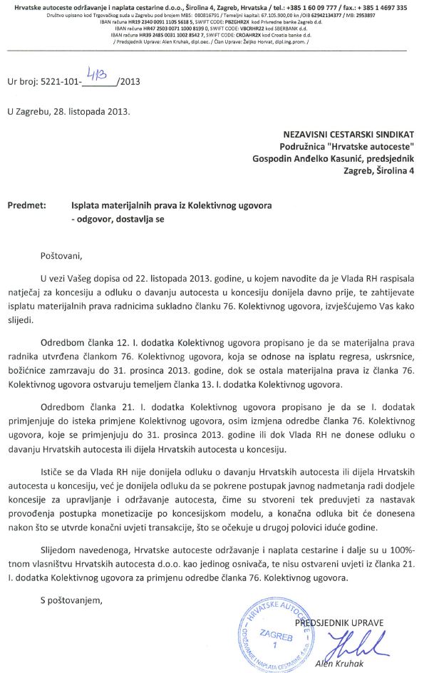 U vezi Vašeg dopisa od 22. listopada 2013. godine, u kojem navodite da je Vlada RH raspisala natječaj za koncesiju a odluku o davanju autocesta u koncesiju donijela davno prije, te zahtijevate isplatu materijalnih prava radnicima sukladno članku 76. Kolektivnog ugovora, izvješćujemo Vas kako slijedi.