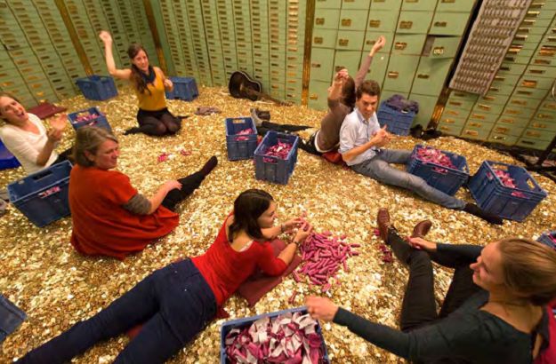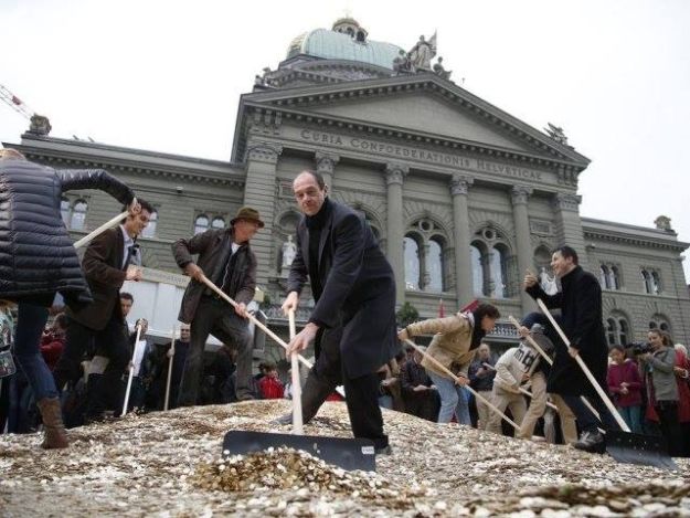 NA SAVEZNOM trgu, ispred švicarskog parlamenta, uoči predavanja peticije o ustavnom referendumu o uvođenju bezuvjetnog temeljnog prihoda građana, dvije su inicijative organizirale spektakularni performans. U ime osam milijuna građana Švicarske iz kamiona su na trg istovarili 8 milijuna kovanica od pet centi, 14 tona novca u iznosu od 400.000 švicarskih franaka!