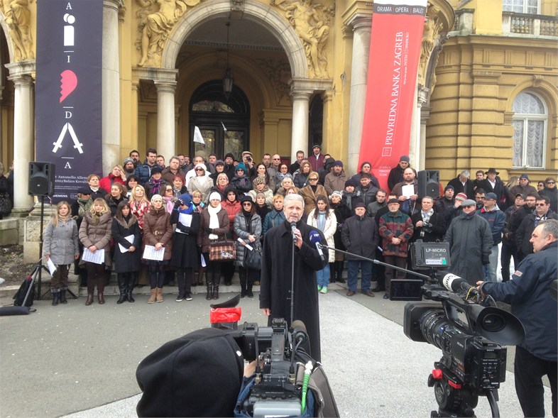 Skup je simbolično otvorila arija Zbor židova iz Verdijeve opere Nabucco, a podržao ga je i čelnik Nezavisnih hrvatskih sindikata (NHS) Krešimir Sever koji je vladu optužio da ne vodi dijalog, već dekretima i naredbama donosi zakone bez konzultacija sa socijalnim partnerima, dok je premijera Zorana Milanovića prozvao za stajanje daleko od zbilje. Udariti na kulturu znači udariti u jedan od temelja naroda, kazao je Sever, te poručio kako će NHS podržati sve akcije kulturnjaka u borbi za njihova prava.