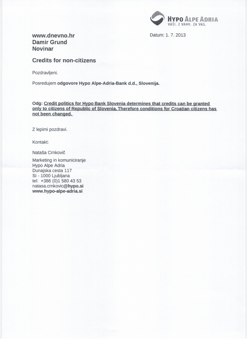 - Kreditna politika Hypo banke za hrvatske građane određuje da krediti mogu biti odobreni jedino građanima Republike Slovenije. Uvjeti kreditiranja za hrvatske građane nisu se promijenili (unatoč ulasku Hravtske u EU) - poručuje u službenom priopćenju Crnković.