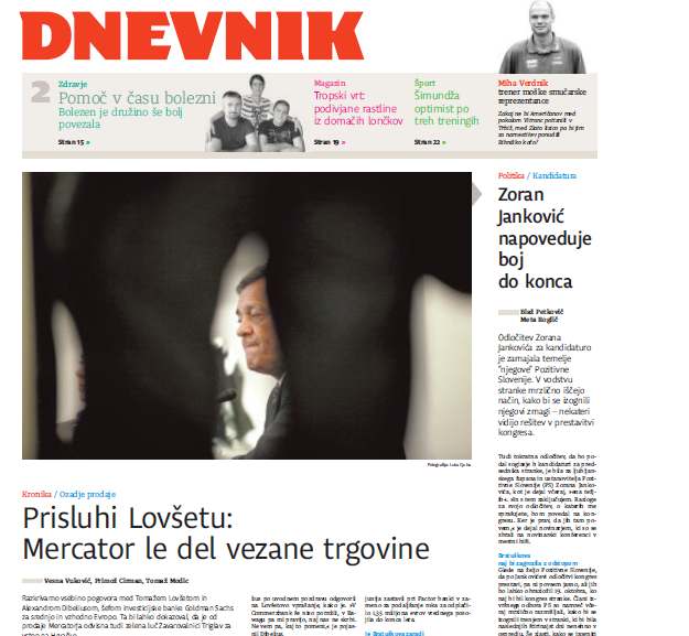 SLOVENSKI list Dnevnik objavio je dio razgovora između Tomaža Lovšea i Ivice Todorića oko kupovine Mercatora, najvećeg slovenskog trgovca i najvećeg poslodavca u Sloveniji, ali i detalje pregovora između Lovšea i Alexandra Dibeliusa, šefa investicijske banke Goldman Sachs za srednju i istočnu Europu. Sadržaj tih pregovora, kako piše Dnevnik, dokazuje da je prodaja Mercatora Agrokoru samo dio trgovine s više milijuna eura vrijednim poslovima u trokutu između Hrvatske, Slovenije i međunarodnih investicijskih banaka. No, iz razgovora čije snimke posjeduje Dnevnik, a radi zaštite ideniteta izvora ne mogu ih objaviti u cijelosti, spominje se i lobiranje kod ministra financija Slavka Linića!