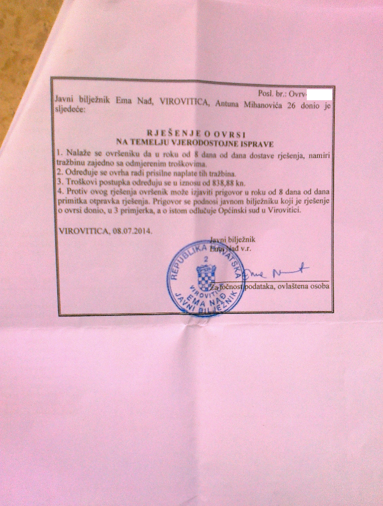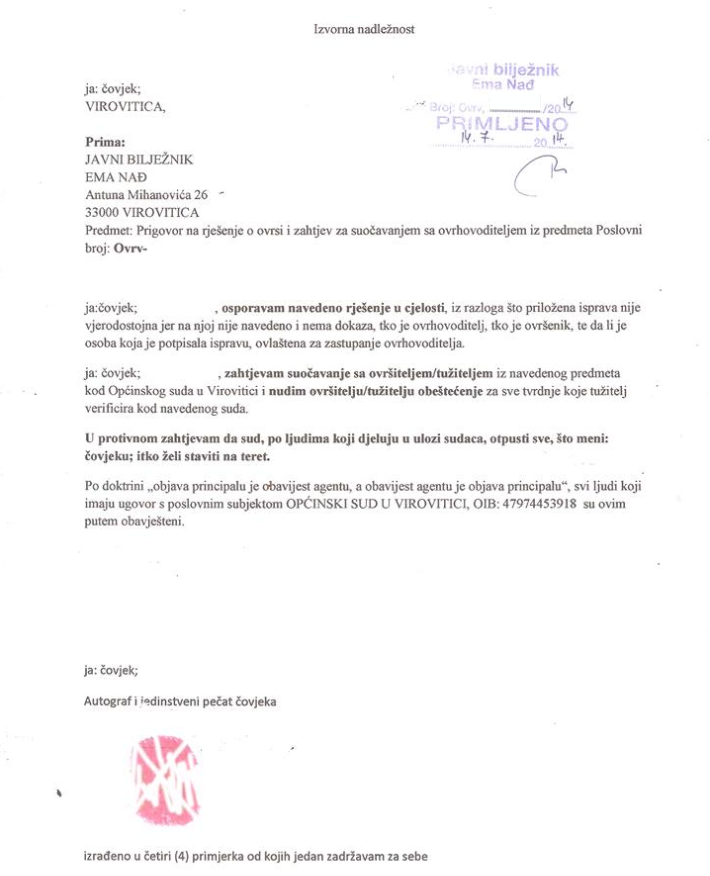 "Ja čovjek, osporavam rješenje u cijelosti, iz razloga što priložena isprava nije vjerodostojna jer na njoj nije navedeno i nema dokaza tko je ovhovoditelj, a tko ovršenik, te je li osoba koja je potpisala ispravu ovlaštena za zastupanje ovrhovoditelja.
