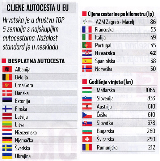 A DO TADA bi ipak bilo dobro znati da postojeći koncesinori u Hrvatskoj kilometar auto ceste naplaćuju i dvostruko više nego što stoji onaj kilometar u vlasništvu hrvatske države (HAC i AZR). Vožnja autocestom Zagreb -Macelj najskuplja je u Hrvatskoj. Cestarina po kilometru je 80 lipa, a na Hrvatskim auto cestama 46 lipa za 1 km.