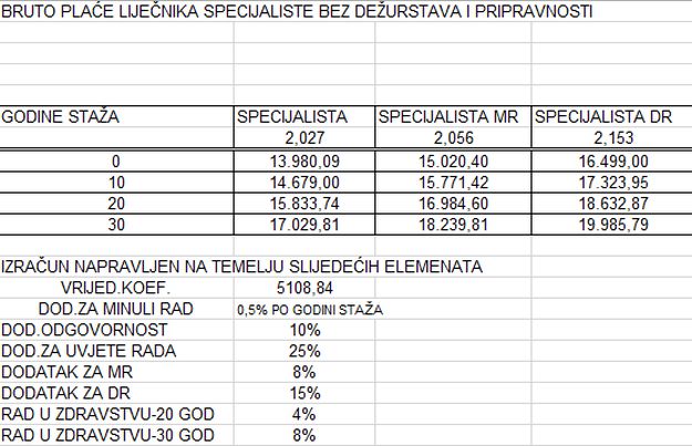 U KBC-u Rijeka specijalist s 20 godina staža ima plaću od 9.813 kuna, s time da u toj bolnici nisu naveli kolika je plaća s dežurstvima. Iz KBC-a Osijek poslali su nam informacije o bruto plaći bez dežurstava i pripravnosti koja za liječnika-specijalista s 20 godina staža iznosi 15.833 kune, specijalista s magisterijem 16.984 kune te specijalista s doktoratom 18.632 kune. U tablicama možete vidjeti i ostale informacije o plaćama.