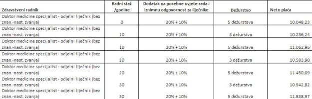 U KBC-u Zagreb odjelni liječnik s 20 godina staža i tri dežurstva mjesečno ima neto plaću od 10.583 kune. S pet dežurstava plaća mu je 11.450 kuna.