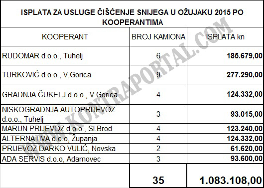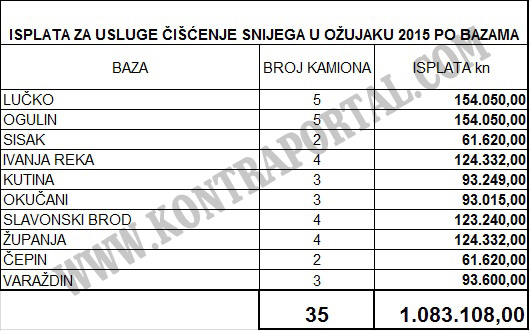 KONTRAPORTAL posjeduje mjesečni obračun isplate naknade kooperantima HAC-ONC-a za pružanje usluga čišćenja snijega na autocestama u vlasništvu HAC-a. Iako snijeg nije ni padao HAC-ONC isplaćuje kooperantima naknadu za nerad.