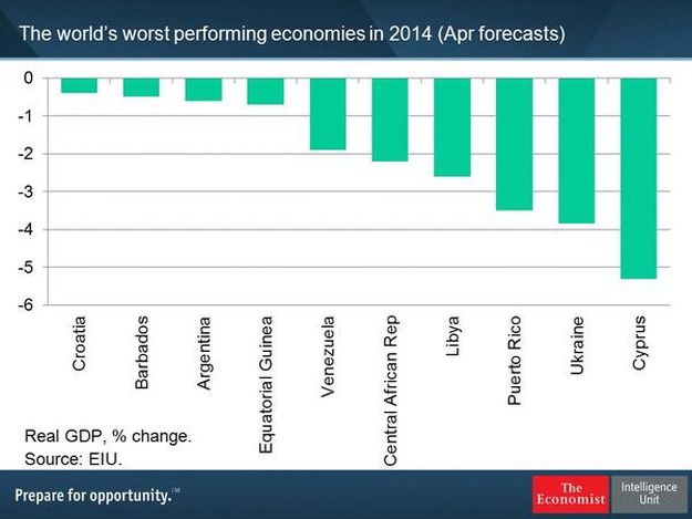 Ekonomska kriza koja je na Cipru kulminirala u ožujku 2013. godine polako daje znakove stabilizacije. Ekonomska politika u idućih nekoliko godina bit će definirana programom pomoći koji je ovoj zemlji odobren od strane Europske unije i međunarodnog monetarnog fonda. Procijenjeni pad BDP-a u 2013. iznosi 5,7%, dok se očekuje da će realni pad u 2014. iznositi 5,3%, a u 2015. njihovo gospodarstvo past će za 1,1%.