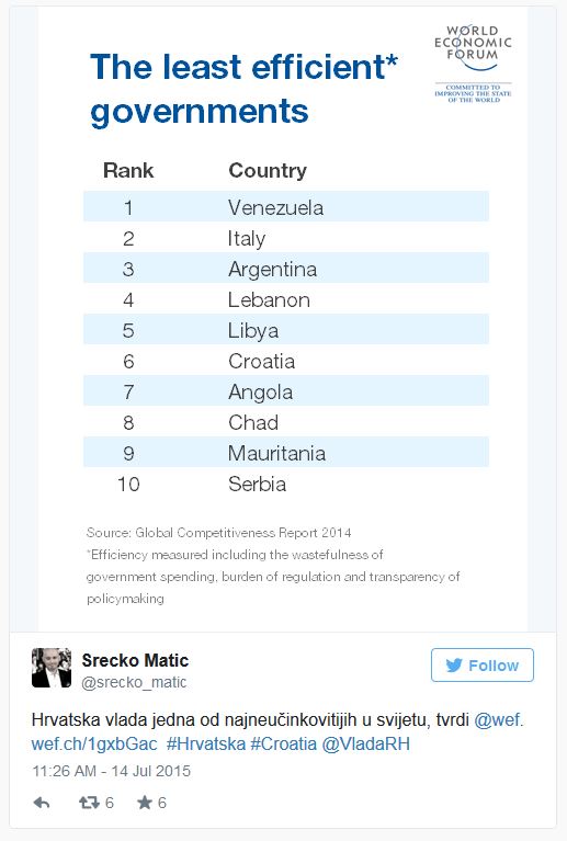 Godišnje izvješće Svjetskog ekonomskog foruma o konkurentnosti hrvatsku je vladu stavilo na samo dno ljestvice najučinkovitijih vlada pa je tako zauzelo neslavno šesto mjesto, iza Venezuele, Italije, Argentine, Libanona i Libije.