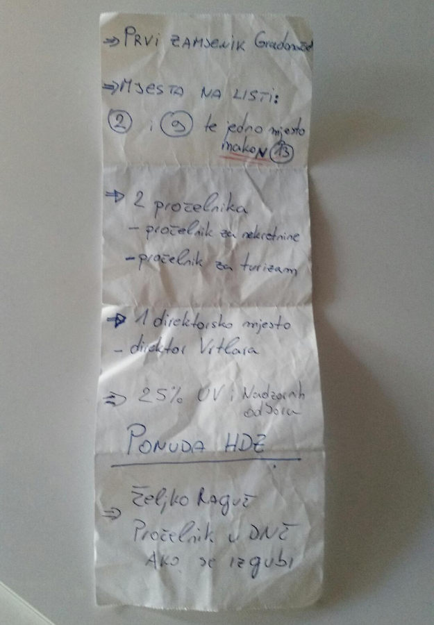 Raguž je od HDZ-a za sebe i svoje stranačke kolege u slučaju pobjede na izborima tako tražio mjesto prvog zamjenika gradonačelnika, drugo i sedmo mjesto na koalicijskoj listi za Gradsko vijeće, te dva mjesta iza 13. mjesta na listi, fotelju predsjednika Gradskog vijeća, dva pročelnička mjesta i to u upravnim odjelima za nekretnine, te za poduzetništvo, turizam i pomorstvo, mjesto direktora gradskog poduzeća Vrtlar, 25 posto fotelja u upravnim i nadzornim odborima, te 15 posto od ukupnih zaposlenja, odnosno, kako stoji u Raguževom dopisu, oko pet radnih mjesta.