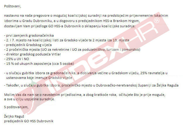 No, Index je u posjedu dopisa koji pokazuje da je Raguž do zadnjeg časa koketirao i s dubrovačkim HDZ-om, koji je lokalnim HSS-ovcima također nudio suradnju. U tom dopisu, kojeg je Raguž dubrovačkim HDZ-ovcima poslao 8. veljače, predsjednik Gradskog odbora HSS-a Dubrovnik navodi koje sve funkcije HDZ njegovoj stranci mora ustupiti ukoliko žele sklopiti predizbornu koaliciju.