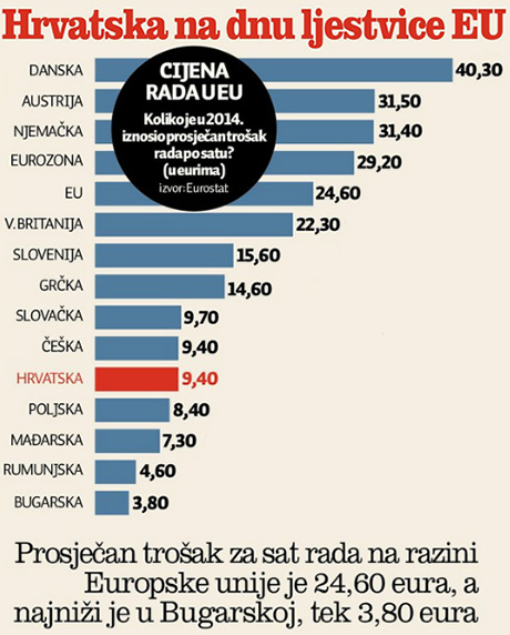 Istraživanje koliko je u 2014. po satu radnik stajao poslodavca proveo je Eurostat. Prosječan trošak za sat rada na razini Europske unije je 24,60 eura, a najniži je u Bugarskoj, tek 3,80 eura
