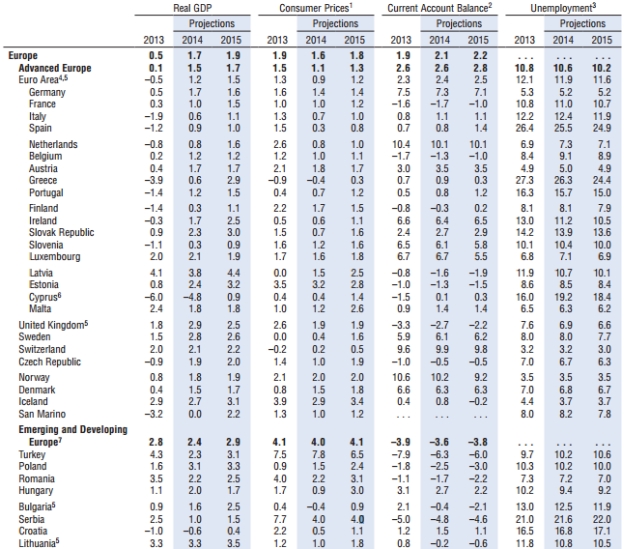 Za Europu MMF u ovoj godini predviđa rast BDP-a od 1,7 posto, a u 2015. godini od 1,9 posto. Inflacija u Europi bi prema procjeni MMF-a u ovoj godini trebala iznositi 1,6, a u idućoj 1,8 posto.