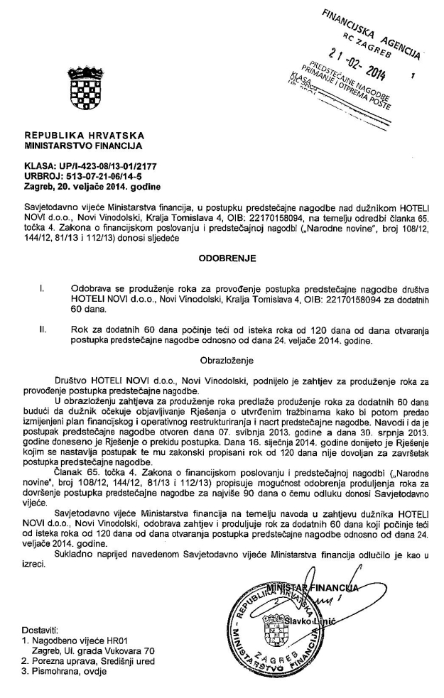 Savjetodavno vijeće Ministarstva financija je 20. veljače ove godine odobrilo produženje roka za provođenje postupka predstečajne nagodbe za dodatnih 60 dana, odnosno Orešar i Širola umjesto 120 dana sad imaju rok od 180 dana za završetak postupka predstečajne nagodbe iznova otvorenog 24. veljače. Cijela priča oko predstečajne nagodbe "Hotela Novi" tako će biti završena najranije sredinom kolovoza ove godine i to ukoliko vlasnici ne uspiju isposlovati nove odgode.