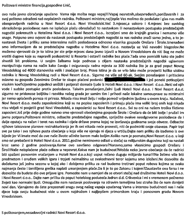 Ogorčeni svime što se događa u "Hotelima Novi" i sestrinskoj tvrtki "Novi Resort", radnici su pisali i ministru financija Slavku Liniću kojeg mole da im da priliku za izlazak iz ove bijede. Kažu, ne mogu vjerovati da je Linić dao svoj blagoslov nastavku postupka predstečajne nagodbe za "Hotele Novi" kad je i sam krajem prošle godine izjavio da "ni Bog ne može vratiti dugove". Evo što su radnici sve poručili Liniću: